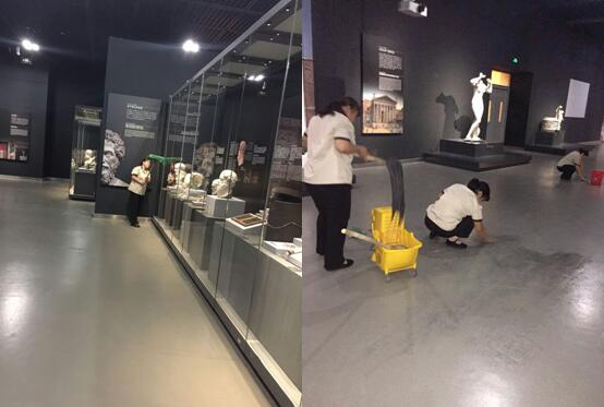 在布展現(xiàn)場(chǎng),來自山東博物館的工作人員以及意大利方工作人員都十分細(xì)心。每一件文物在經(jīng)過了專家多次檢驗(yàn)、校對(duì)和拍照后,才由專業(yè)的布展人員進(jìn)行擺放。期間我們的保潔人員更是細(xì)致、認(rèn)真對(duì)每一個(gè)展柜進(jìn)行擦拭,所有展品擺放完后我們對(duì)所有展柜進(jìn)行全面的清理、擦拭工作。最后對(duì)地面進(jìn)行除膠、清洗工作,積極配合布展工作。