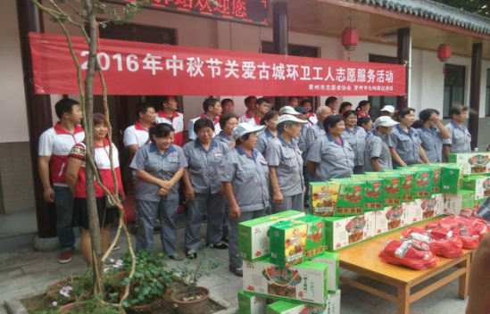 2016年9月14日,在中秋佳節(jié)即將到來之際,由青州市志愿者協(xié)會(huì)和青州市古州驛站酒店聯(lián)合為青州古城二十幾名環(huán)衛(wèi)工人送來了中秋節(jié)禮物和祝福,感謝他們?yōu)槌鞘协h(huán)境做出的貢獻(xiàn)。每個(gè)環(huán)衛(wèi)工人臉上都洋溢著幸福的笑容,一位環(huán)衛(wèi)大姐說,雖然我們環(huán)衛(wèi)工人風(fēng)里來雨里去、早出晚歸的很辛苦,但現(xiàn)在越來越多的人給予我們環(huán)衛(wèi)工人關(guān)心、理解和支持,我們會(huì)用自己的微薄之力,給市民營造干凈優(yōu)美的城市環(huán)境。