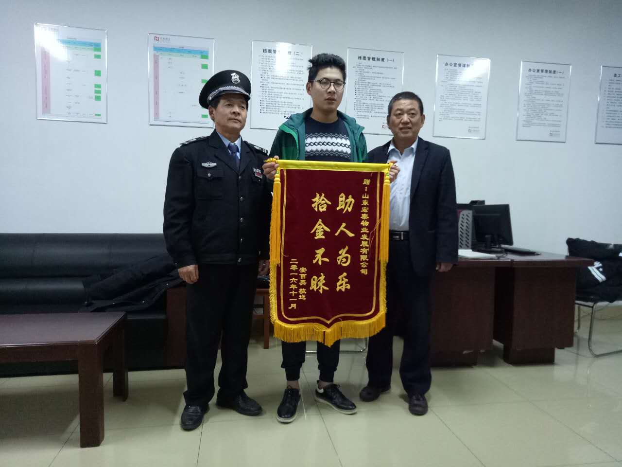 11月16日傍晚,一面繡有“拾金不昧助人為樂(lè)”8個(gè)金光大字的錦旗被一位充滿感激之情的學(xué)生送到宏泰物業(yè)泰山醫(yī)學(xué)院校本部辦公室。