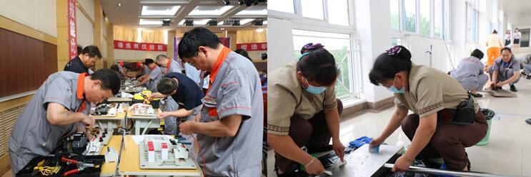 大賽第三輪是保潔和工程的現(xiàn)場(chǎng)實(shí)操,保潔的主要考核內(nèi)容為地面清潔以及塵推使用、不銹鋼清潔、保養(yǎng);工程的考核內(nèi)容是三相電表帶互感器連接以及電機(jī)正反轉(zhuǎn)控制(互鎖)。雖然比賽是在室內(nèi)進(jìn)行的,但炎熱的天氣并沒有因?yàn)榧ち业谋荣惗兴羟?,參賽人員揮汗如雨,這并不影響選手的專注和熱情。隨著秒表的記錄,選手一個(gè)接一個(gè)的舉手示意完成比賽。比賽的過(guò)程、成果的展示,體現(xiàn)著選手精湛的技能。