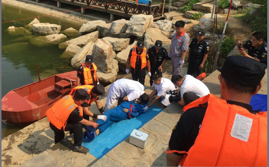 此次演練模擬的意外情況是:湖邊落水施救及湖中溺水施救。現(xiàn)場(chǎng)保安員接到事故警報(bào)后,火速趕到事發(fā)現(xiàn)場(chǎng)了解狀況,同時(shí)向項(xiàng)目部應(yīng)急救援領(lǐng)導(dǎo)小組報(bào)告險(xiǎn)情,項(xiàng)目經(jīng)理接到報(bào)告后立即啟動(dòng)應(yīng)急預(yù)案,應(yīng)急救援、醫(yī)療保障、安全保衛(wèi)、善后處理等應(yīng)急救援小組攜帶救援設(shè)備迅速趕到事故現(xiàn)場(chǎng),各司其職展開救援工作。