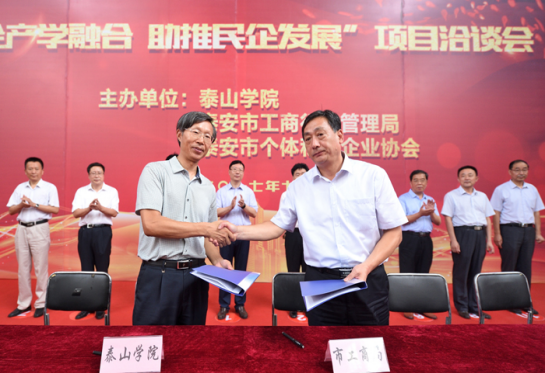 泰安市委副書(shū)記張濤,山東省工商局黨組成員、副局長(zhǎng)郭之祥,泰山學(xué)院黨委書(shū)記范真,泰安市工商局黨組書(shū)記、局長(zhǎng)張京洲,泰山學(xué)院黨委副書(shū)記李玉洋,副院長(zhǎng)王雷亭、于鴻遠(yuǎn)、徐躍,泰安市各縣市區(qū)工商局負(fù)責(zé)人出席洽談會(huì)。泰山學(xué)院黨委副書(shū)記、院長(zhǎng)秦夢(mèng)華主持洽談會(huì)。泰山學(xué)院專(zhuān)家教授與380余位泰安市民營(yíng)企業(yè)家齊聚一堂,共商校企合作,助推地方經(jīng)濟(jì)社會(huì)發(fā)展大計(jì)。