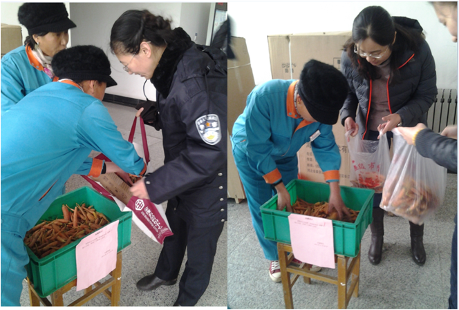 我公司自承接山東警察學(xué)院物業(yè)服務(wù)以來,在征得甲方領(lǐng)導(dǎo)同意的前提下,積極利用學(xué)校閑置資源加以開發(fā)利用,員工利用業(yè)余時間開墾荒地,在項目保潔、綠化部人員辛勤勞動下,種植的綠色、無公害胡蘿卜成熟了。收獲季節(jié)沒有忘記學(xué)院師生,并于2014年11月24日下午13:00點,項目人員將剛剛出土的新鮮胡蘿卜分與山東警察學(xué)院師生共同品嘗,享受綠色、無公害胡蘿卜的美味。剛開始大家都拘謹不好意思來拿,可是品嘗過的師生都相繼拿著袋子來裝,嘴里還說著:“太甜了”,“真好吃”,“謝謝!”等感謝的話語,讓我們員工心里感覺更甜了。隨著胡蘿卜發(fā)放完畢,本次活動圓滿結(jié)束。