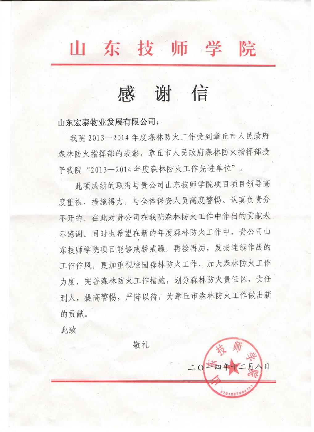 2013-2014年度山東技師學(xué)院項(xiàng)目按照章丘市政府、山東技師學(xué)院要求,堅(jiān)決貫徹“預(yù)防為主,防消結(jié)合”的工作方針。建立健全消防安全制度,成立防火小分隊(duì),劃分防火區(qū)域責(zé)任到人,全面落實(shí)森林防火工作。經(jīng)章丘市政府研究決定:授予山東技師學(xué)院“2013-2014年度森林防火先進(jìn)單位”。為此,山東技師學(xué)院發(fā)來感謝信感謝公司,并給與項(xiàng)目管理人員及秩序維護(hù)員3400元獎(jiǎng)金,以資鼓勵(lì)。