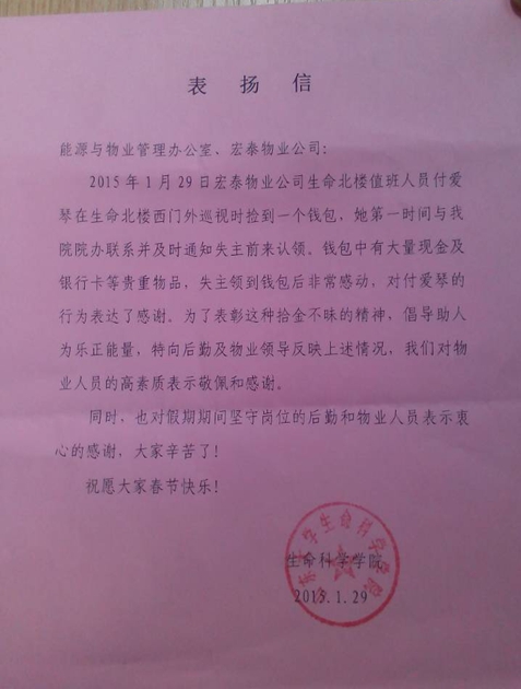 2015年1月29日,山大中心校區(qū)項目樓宇部值班人員付愛琴在生命北樓西門外巡視時撿到一個錢包,包內(nèi)有大量現(xiàn)金及銀行卡等貴重物品,她第一時間與院辦聯(lián)系并及時通知失主,失主對她行為表示感謝,這種拾金不昧的精神,得到了院方領(lǐng)導(dǎo)的表揚,同時對宏泰物業(yè)人員的高素質(zhì)表示敬佩和感謝。