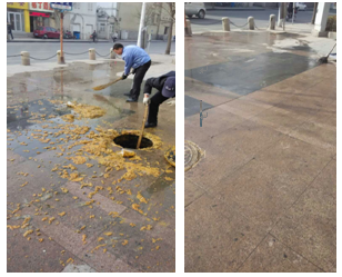 2015年3月20日,與往常的日子一樣,天津悅薈保潔服務項目的劉文勝經(jīng)理又早早到了項目現(xiàn)場。巡視過程中在廣場影城側發(fā)現(xiàn)因外管網(wǎng)跑水,造成大面積的化糞池清淤物。