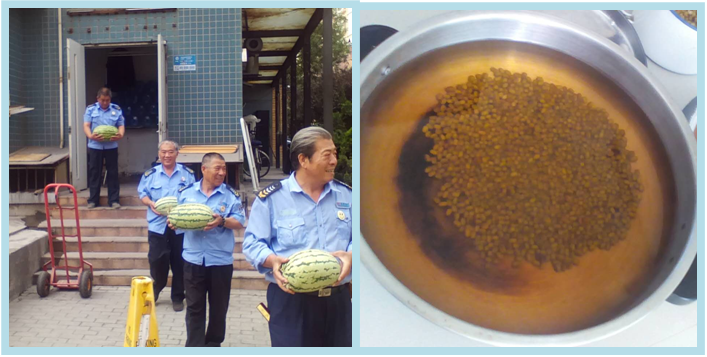 “到了夏天,我們每天都有專人定點(diǎn)煲制涼茶、綠豆糖水,供員工飲用解暑。”也會(huì)不定期購買西瓜,發(fā)放到各個(gè)部門為一線的員工及時(shí)送去清涼。在各個(gè)部門常年配備足量的風(fēng)油精、板藍(lán)根沖劑等防暑降溫藥品。